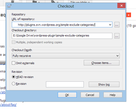 Trong email có URL dùng để truy cập vào SVN Repository, trong ví dụ là http://plugins.svn.wordpress.org/simple-exclude-categories/. Các bước upload plugin như sau:
