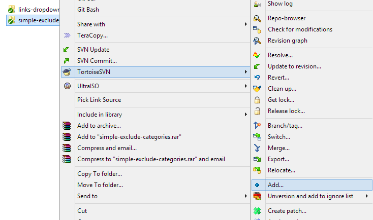 , right-click chọn “TortoiseSVN » Add” và trong cửa sổ liệt kê các file đã thêm vào thư mụcsimple-exclude-categories